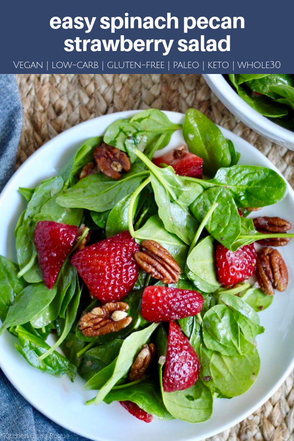 This easy spinach pecan strawberry salad is a simple, delicious, low carb treat! It's vegan, dairy-free, gluten-free too and, with the right dressing, it's easily paleo, whole30 and/or keto diet friendly.